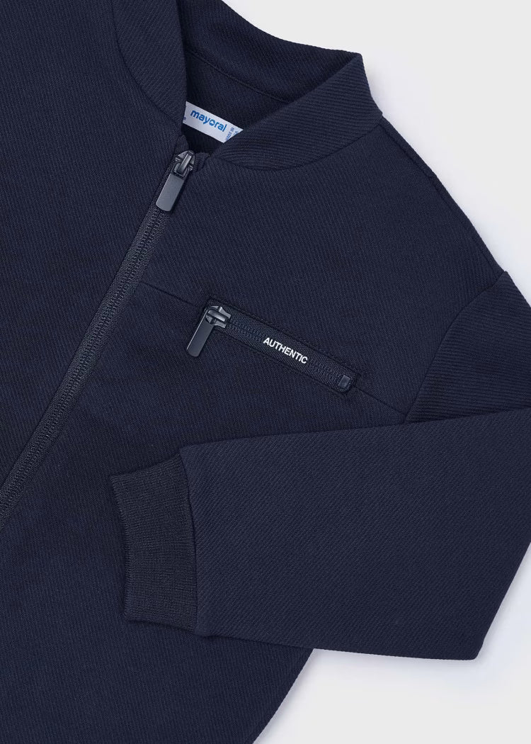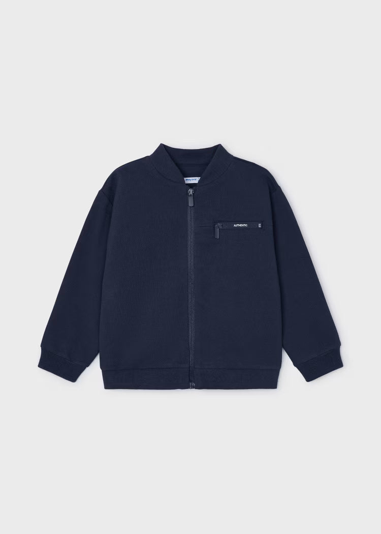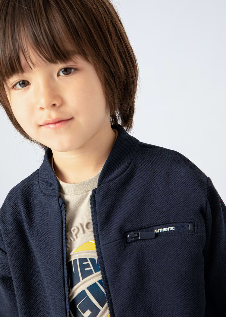 Felpa manica lunga per bambino. Collo bomber. Chiusura centrale con cerniera. Orlo e polsini elasticizzati per una migliore vestibilità. Tasche funzionali nella parte anteriore.