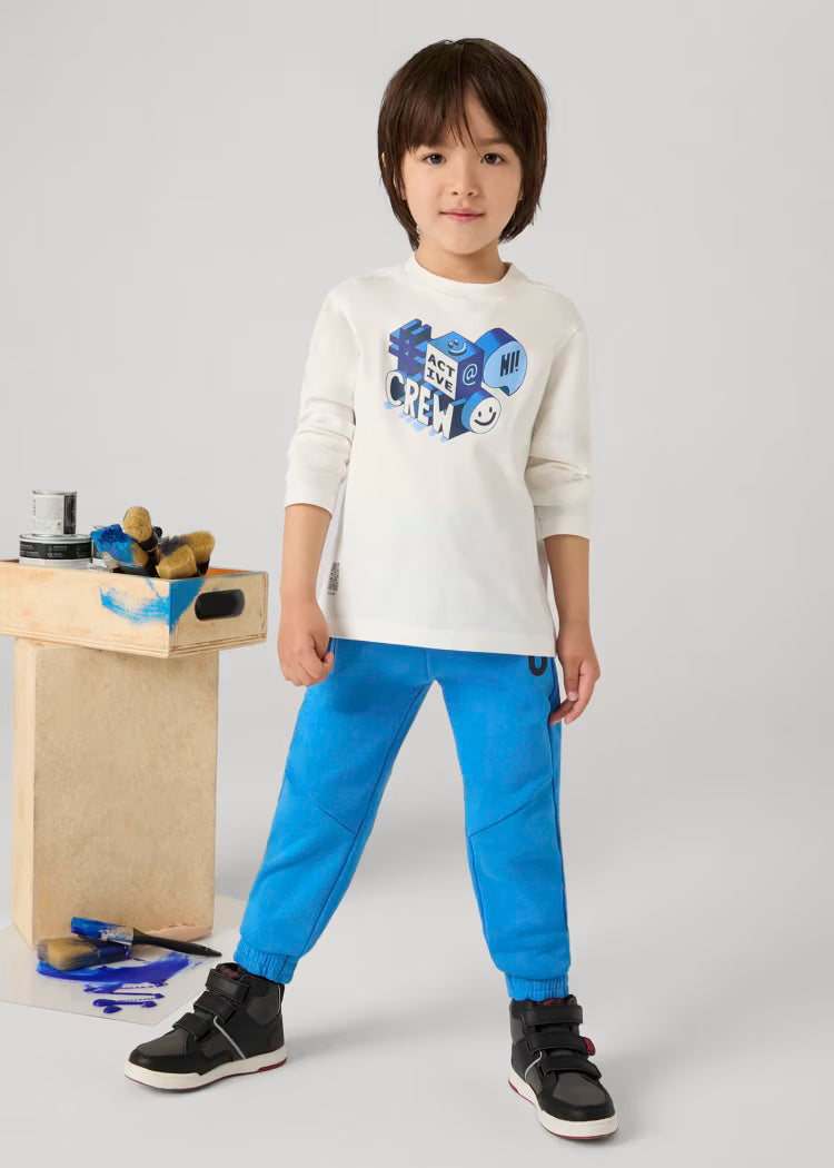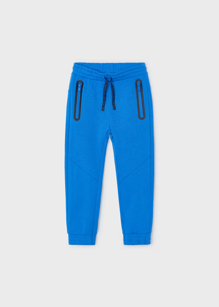 Pantalone per bambino della linea sporty, molto comodo. Vita elasticizzata con cordoncino regolabile. Comodo tessuto leggero e morbido di felpa (pile). Ginocchiere rinforzate nella parte interna pensate per donare maggiore resistenza nella zona più esposta ad usura. Tasche con cerniere.