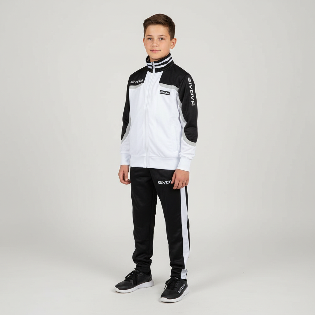 Tuta Givova bambino ragazzo modello "EUROPA" Bianco e nera, ideale da indossare in autunno e inverno. Realizzata tessuto acetato.
