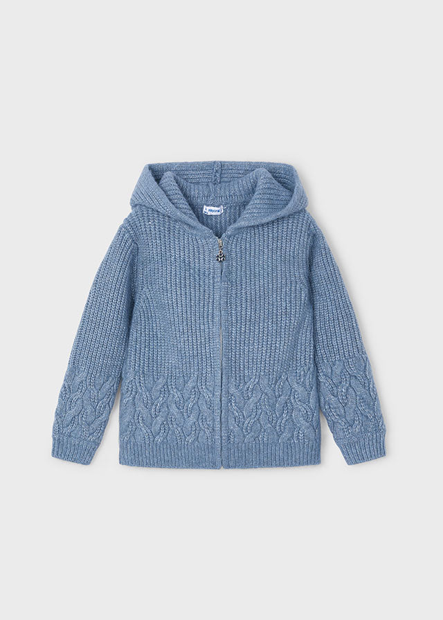 Giacca in maglia manica lunga per bambina. Modello con cappuccio. Chiusura centrale con cerniera. Tessuto caldo e morbido. Orlo e polsini elasticizzati per una migliore vestibilità. Elementi decorativi: elementi decorativi intrecciati.