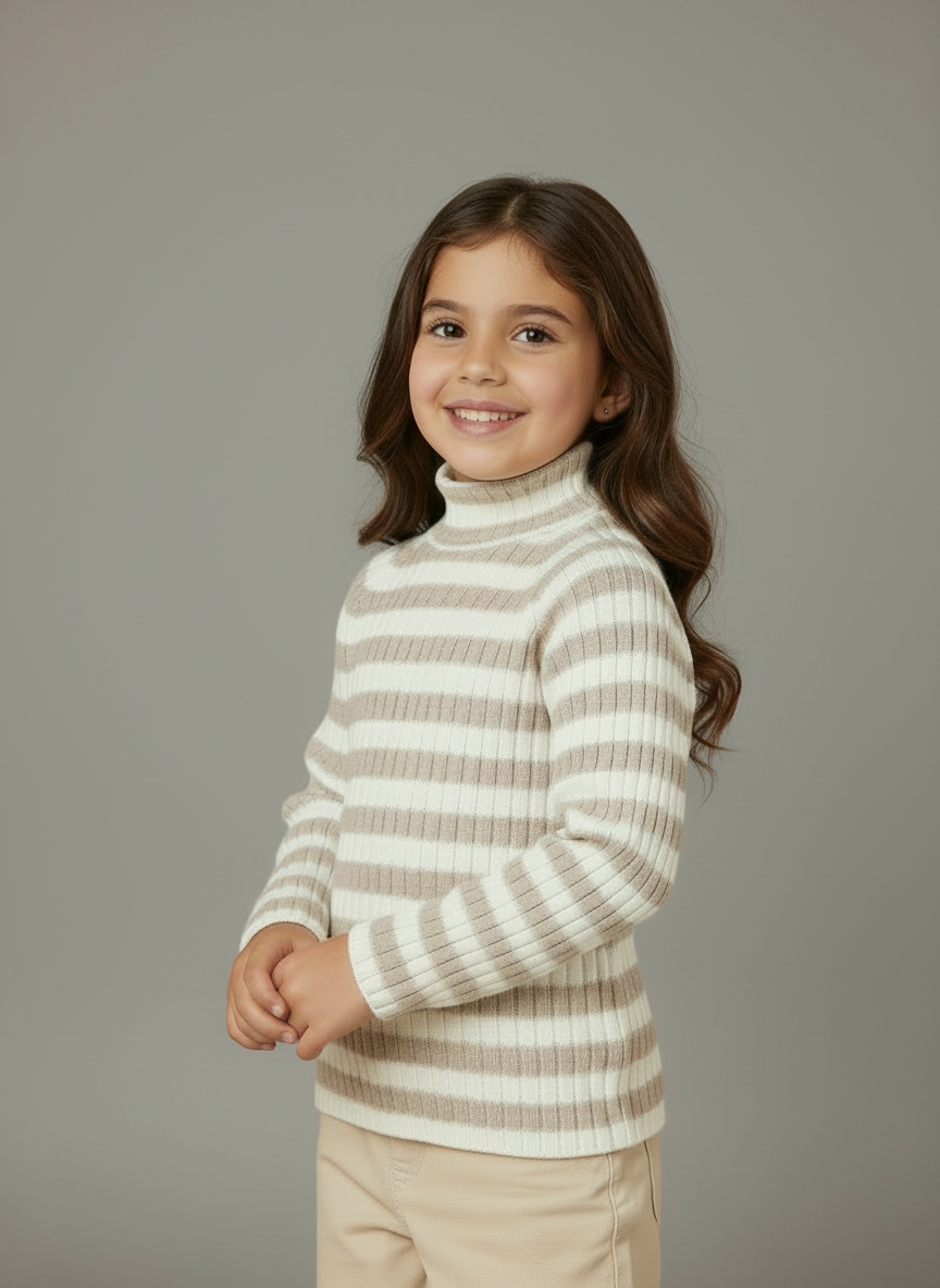 Maglietta manica lunga per bambina. Collo modello lupetto. Tessuto a costine. Trama a righe.