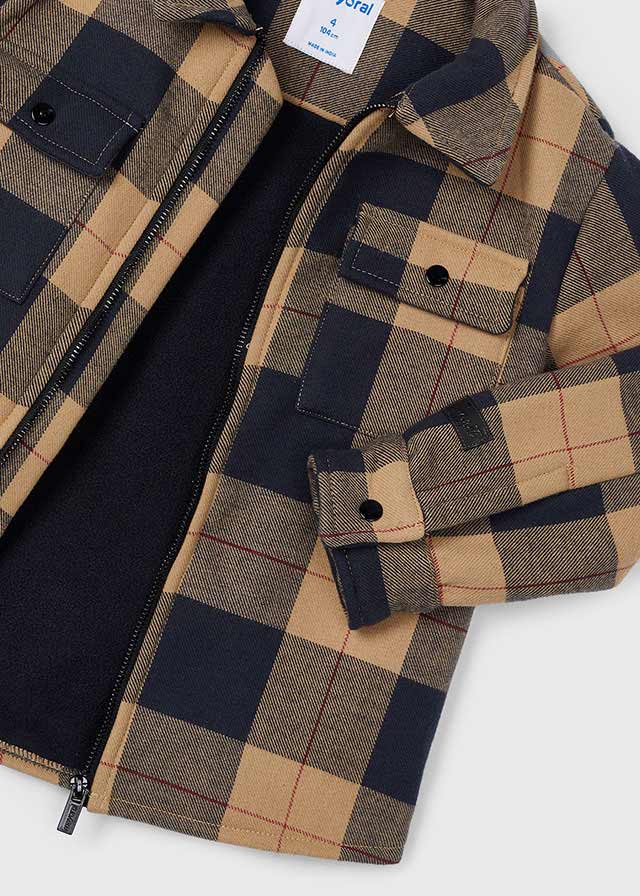 Langarmjacke für Jungen mit geknöpften Manschetten. Hemdkragen. Reißverschluss in der Mitte. Funktionelle Vordertaschen. Karomuster.