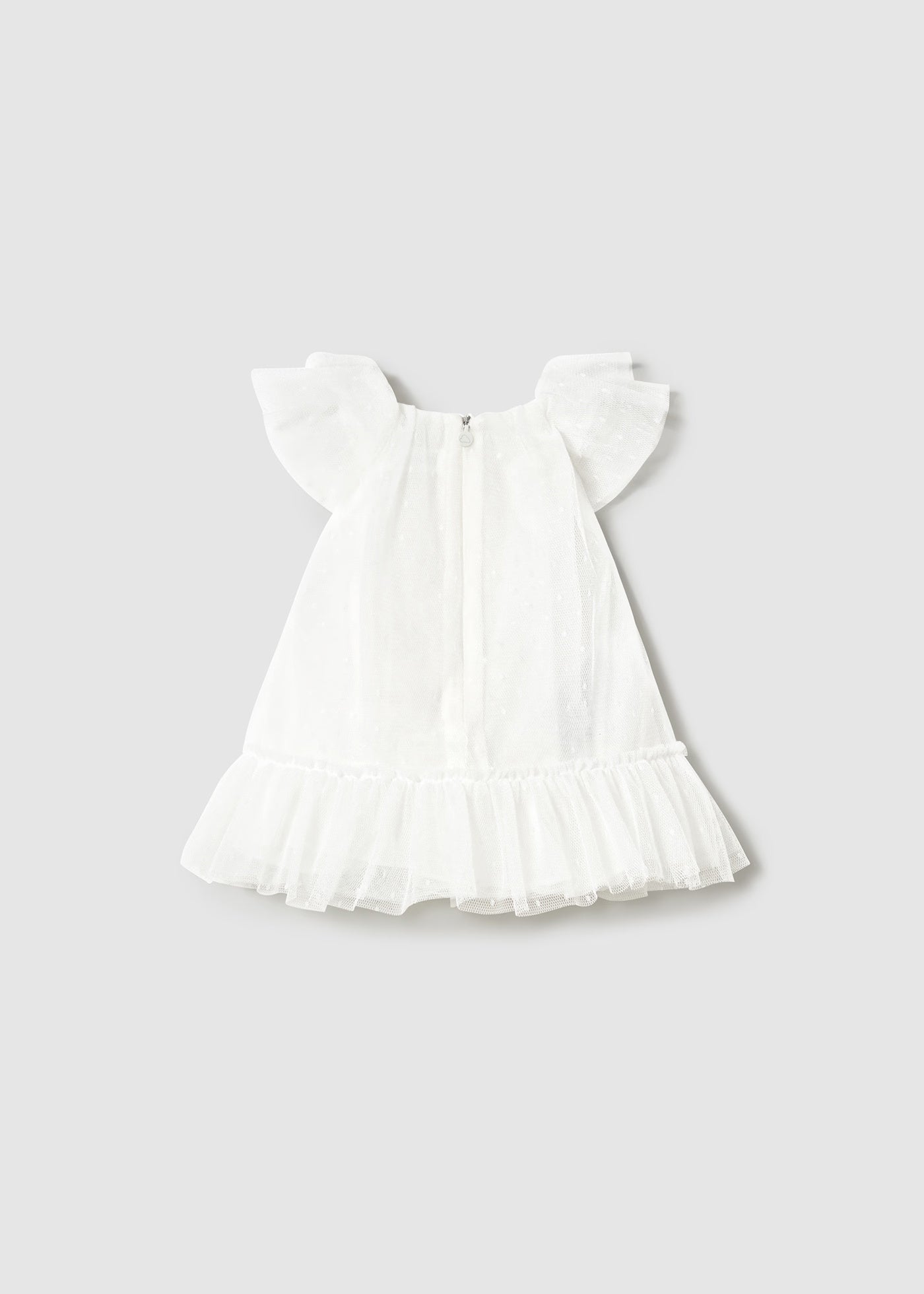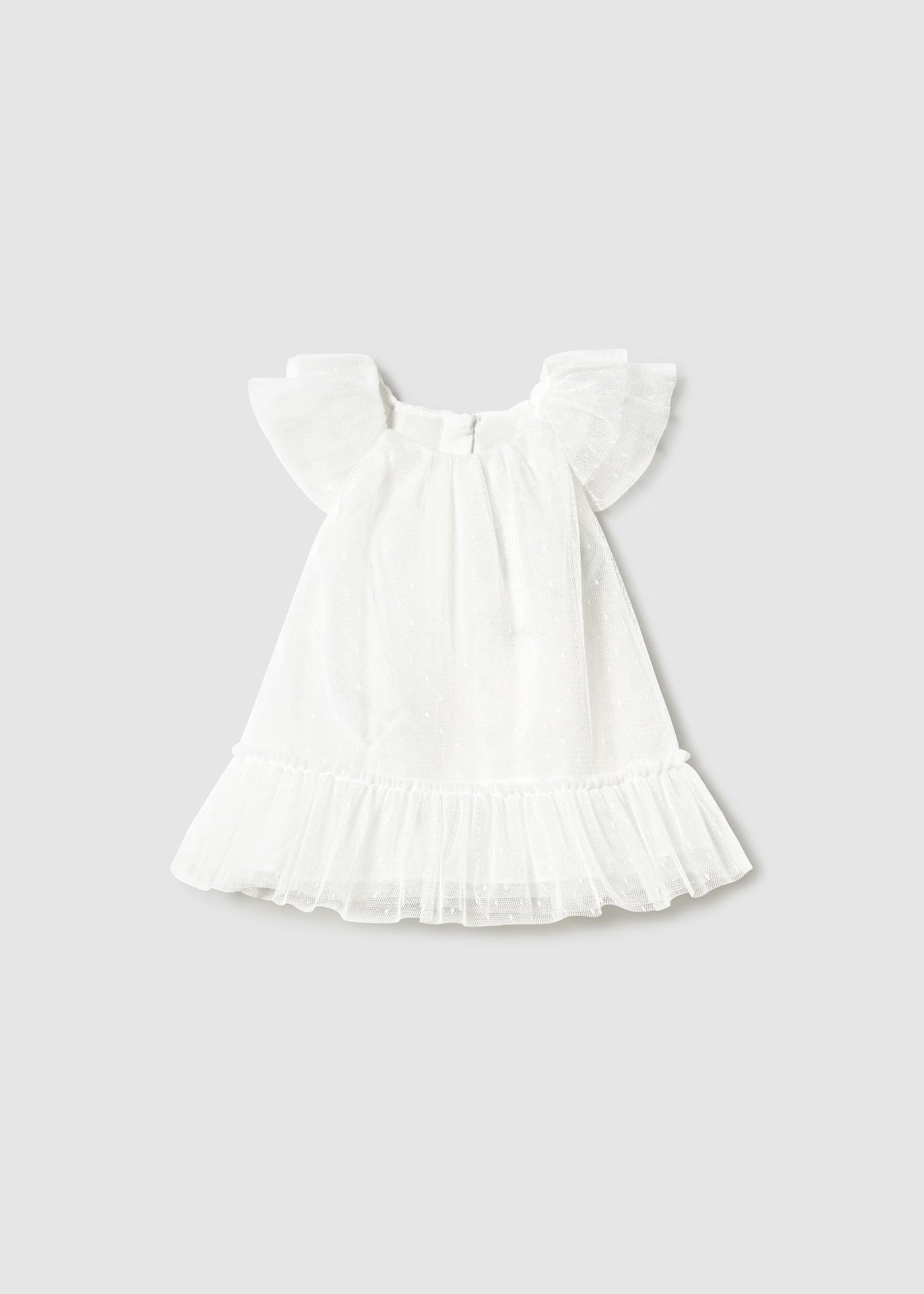Kurzärmeliges Rüschenkleid für Babys. U-Boot-Ausschnitt. Verdeckter Reißverschluss hinten. Aus leichtem, luftigem Tüll. Gefüttert. Rüschendesign.
