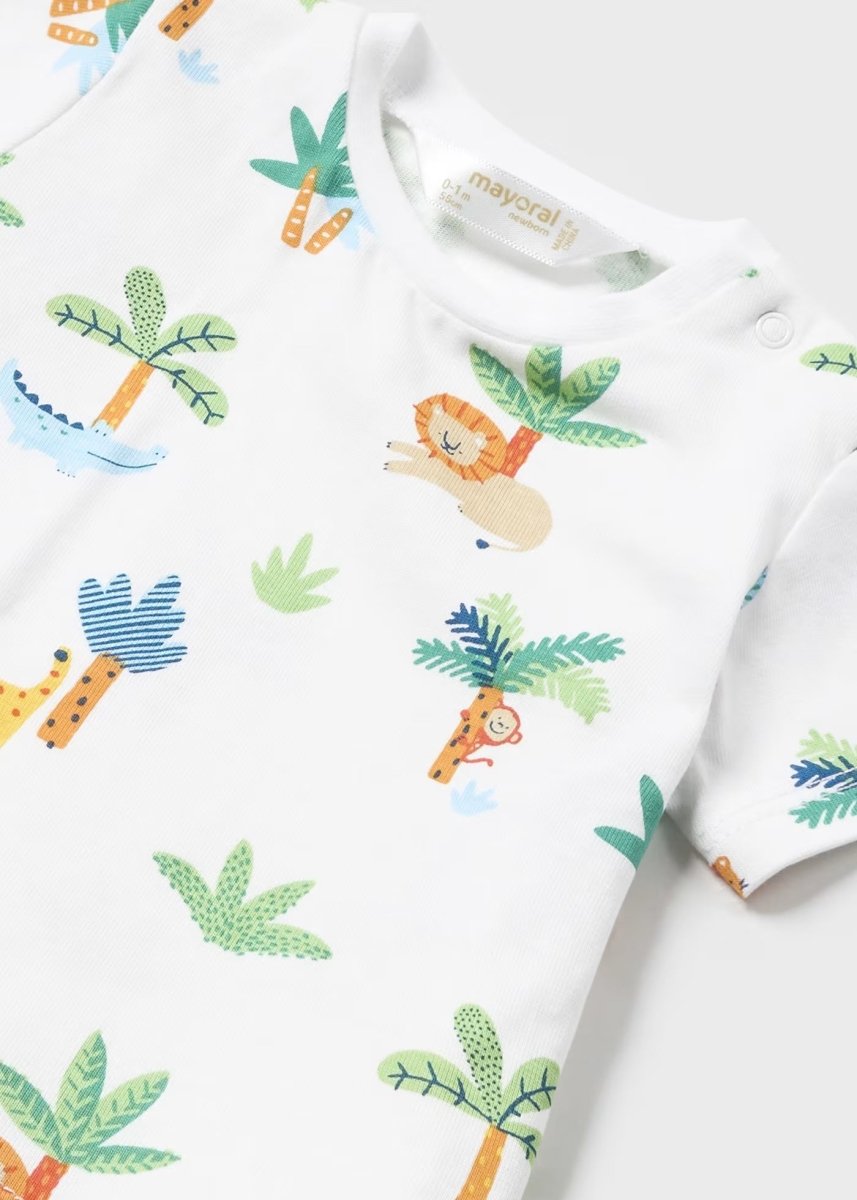 Kurzarm-T-Shirt für Neugeborene. Rundhalsausschnitt. Druckknopfverschluss an der Schulter, der das Tragen des Kleidungsstücks erleichtert. Gedrucktes Design.