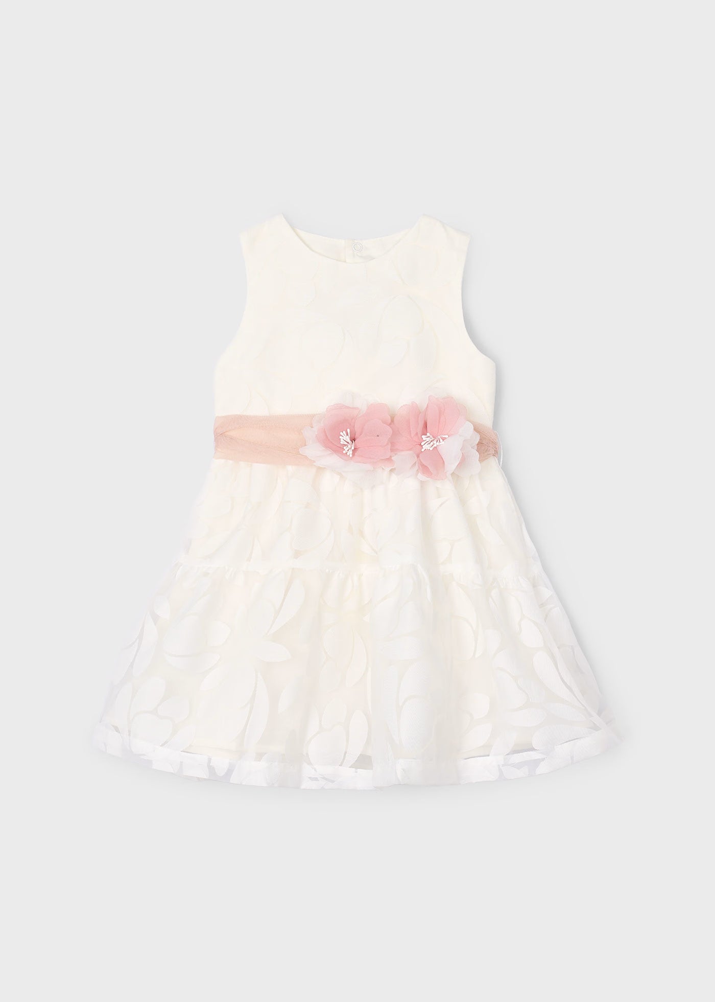 Mädchenkleid aus der Mayoral-Schule, cremefarben mit Blumenmuster und rosa Blumenschärpe.