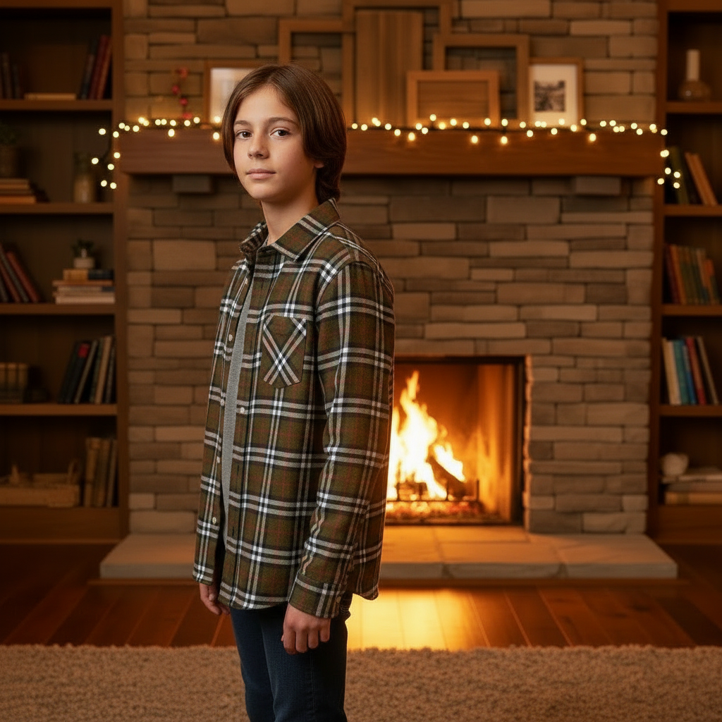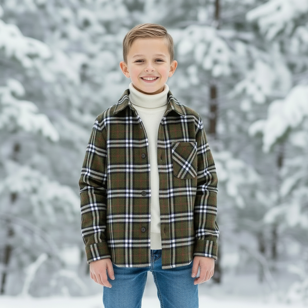 Es wird mit Knöpfen geschlossen. Kariertes Muster in olivgrüner Hintergrundfarbe