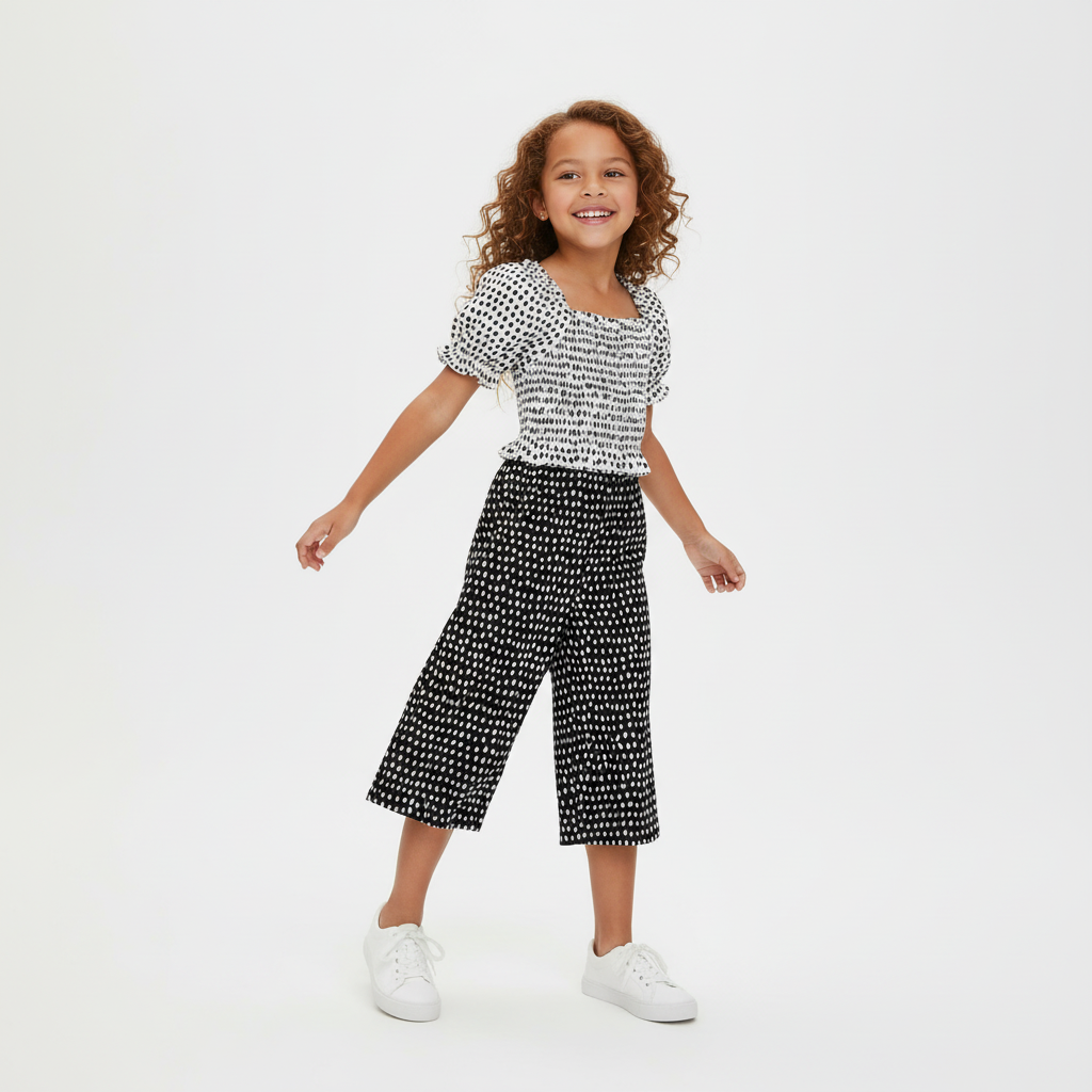 Elastischer Bund für eine bessere Passform. Weicher Stoff für alltäglichen Komfort. Dekorative Elemente: dekorative Rüsche. Schwarz-weiße Farbe mit Tupfendruck.