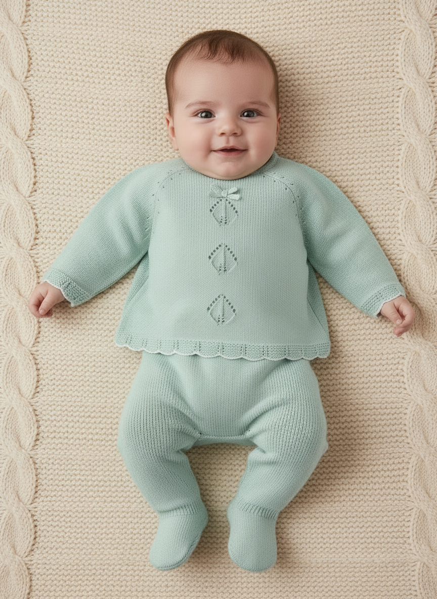 ECOFRIENDS-Kleidungsstück aus 100 % nachhaltiger Baumwolle. Dieses zweiteilige Trikot-Outfit für Neugeborene besteht aus einem Pullover und einer passenden Gamasche.