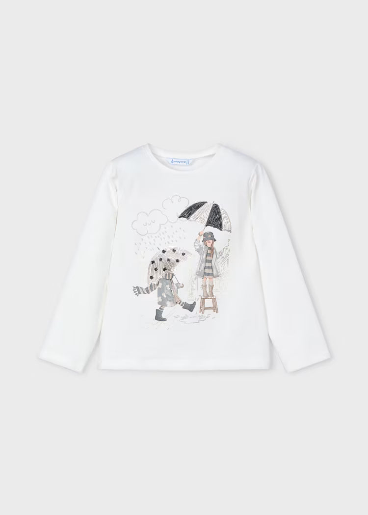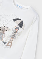 Langarm-T-Shirt für Mädchen. Weicher Stretch-Baumwollstoff. Dekorative Elemente: dekorative Applikation, Zeichnung auf der Vorderseite,