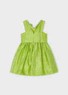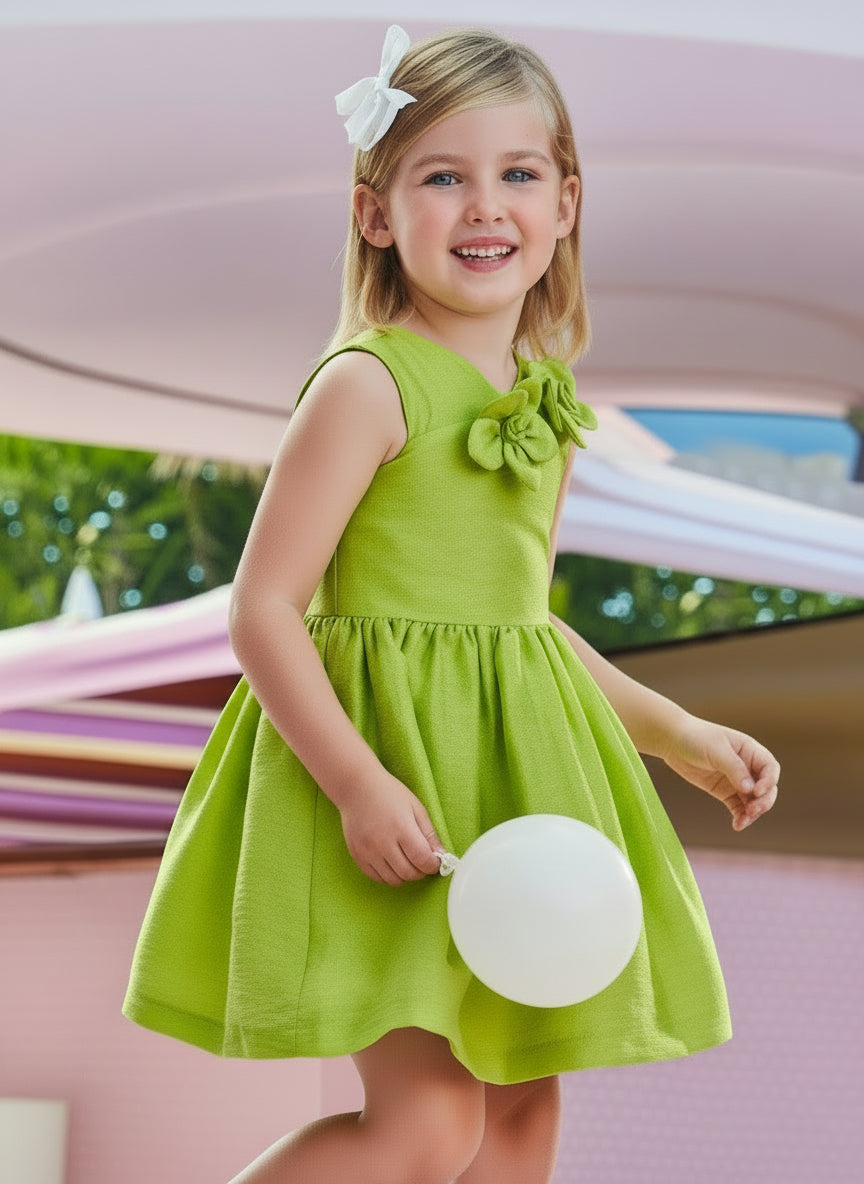 Kurzarmkleid für Mädchen. Hintere Öffnung mit unsichtbarem Reißverschluss. Konfekt aus zarter Guipure für die elegantesten Anlässe. Modell mit Falten.
