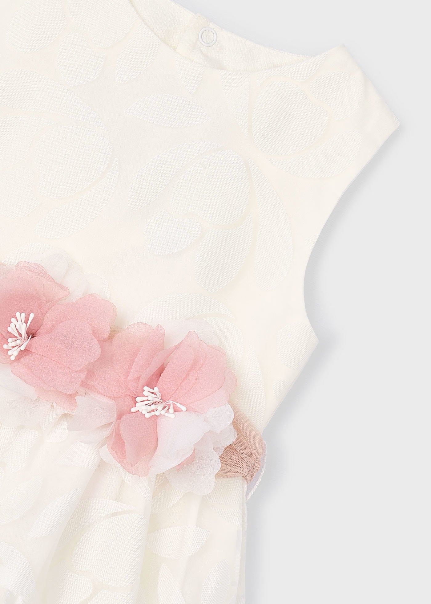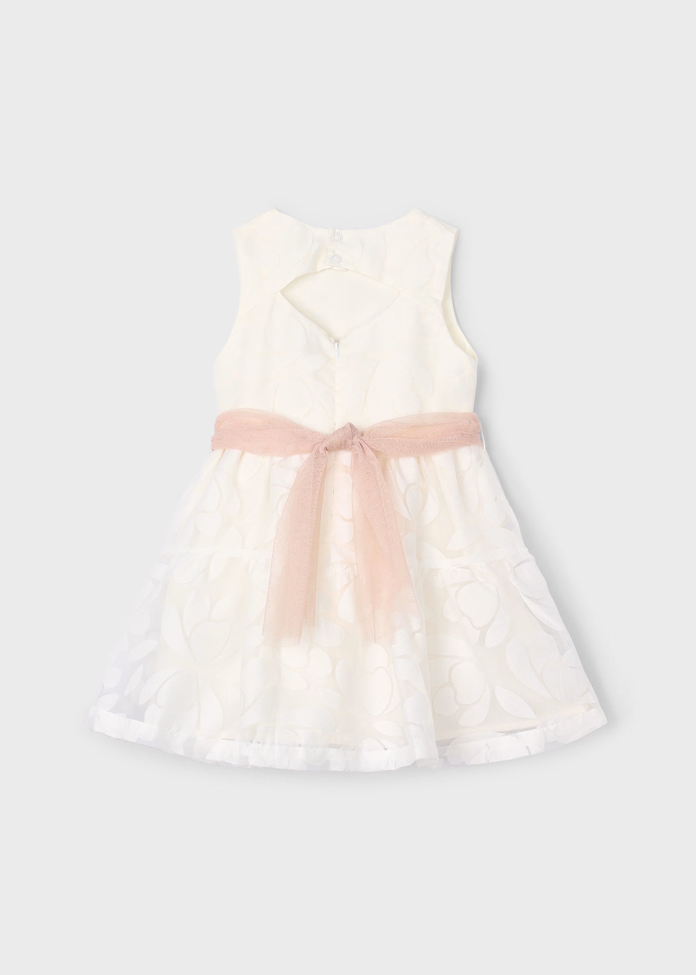 Mädchenkleid aus der Mayoral-Schule, cremefarben mit Blumenmuster und rosa Blumenschärpe.
