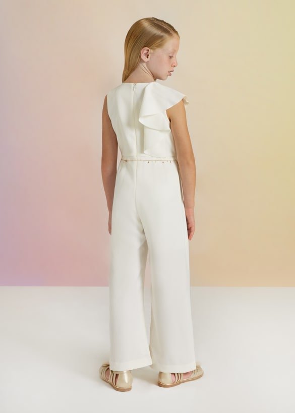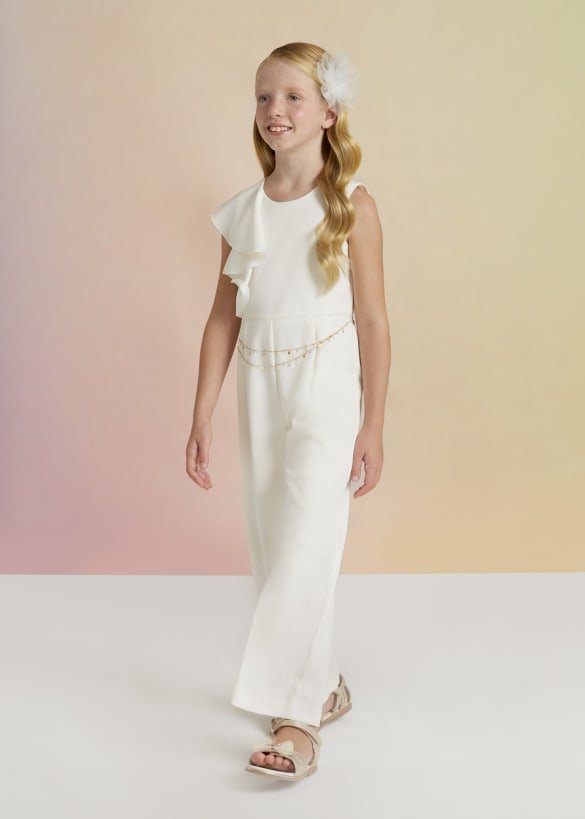 - Langer einfarbiger Kreppoverall mit Rüschen an der Schulter für Mädchen.