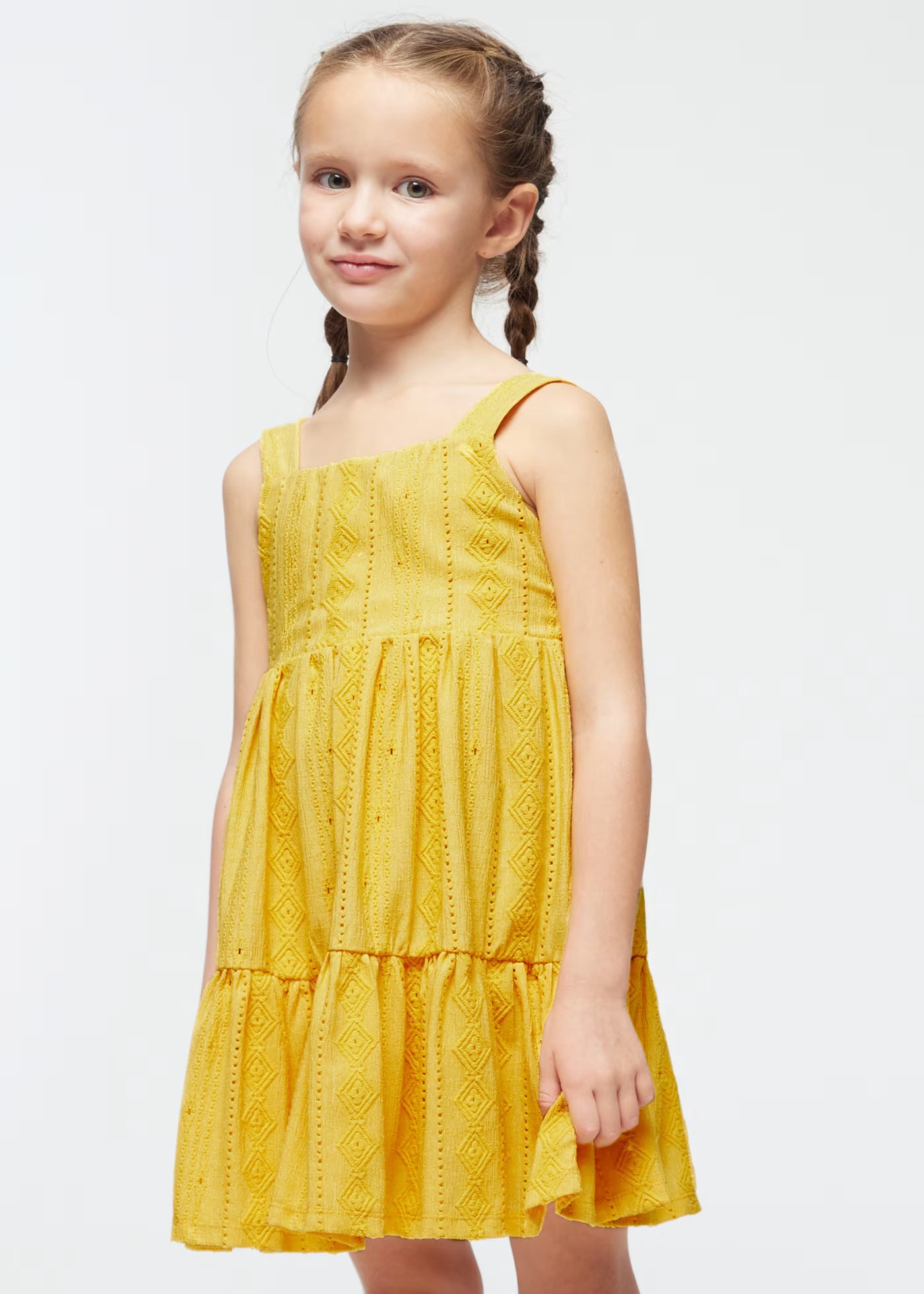 Kurzarmkleid für Mädchen. Hintere Öffnung mit unsichtbarem Reißverschluss. Konfekt aus zarter Guipure für die elegantesten Anlässe. Modell mit Falten.