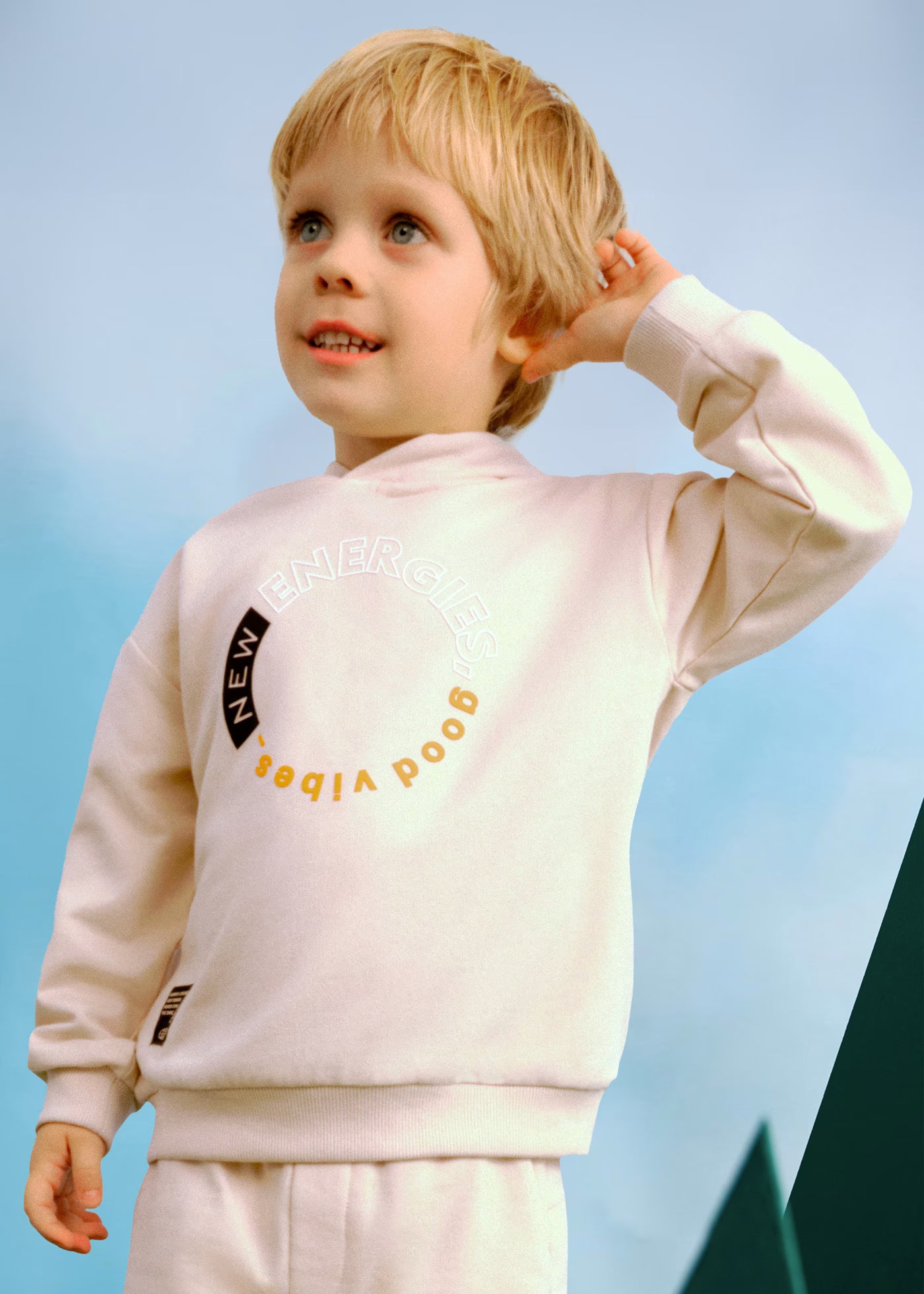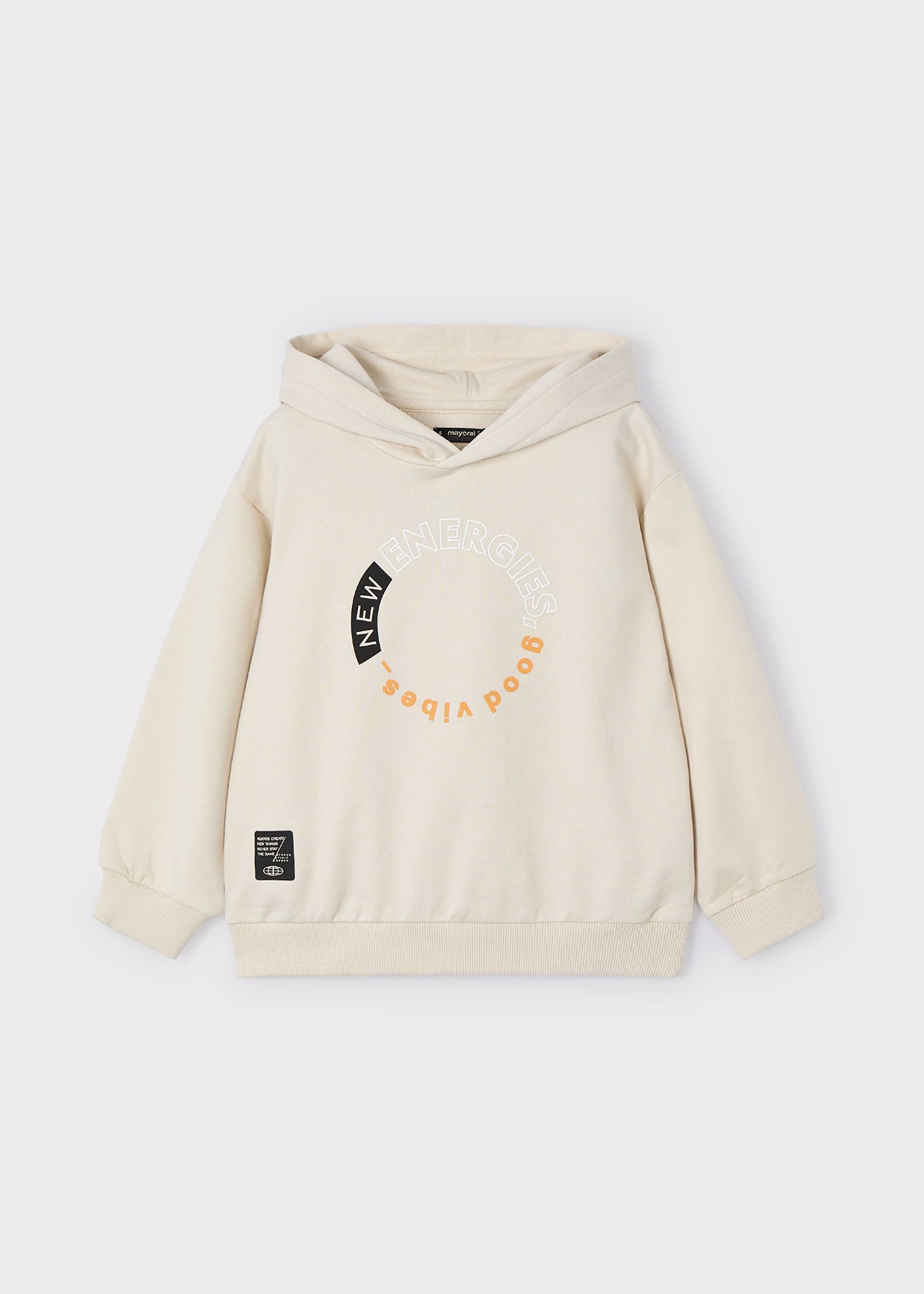 Felpa manica lunga per bambino. Colletto con cappuccio. Polsini e orlo elasticizzati per una migliore vestibilità. Elementi decorativi: scritta nella parte anteriore.