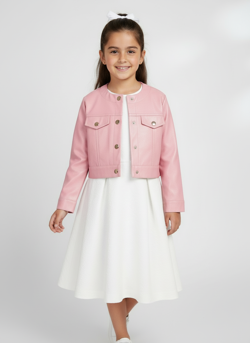 Giacca manica lunga per bambina con polsini con bottoni. Girocollo. Chiusura con bottoni a pressione nella parte anteriore. Parte esterna in similpelle. Morbida fodera interna in poliestere. Finte tasche anteriori decorative. Rifiniture metallizzate.