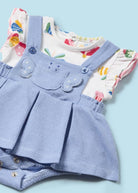 Kurzarm-Strampler für Babys. Design mit Fake-Latzhose-Overlay. Druckknopfverschluss auf der Rückseite, der das Tragen des Kleidungsstücks erleichtert. Druckknopfverschluss an der Innenseite der Oberschenkel erleichtert die Passform. Dekorative Elemente: dekorative Rüsche
