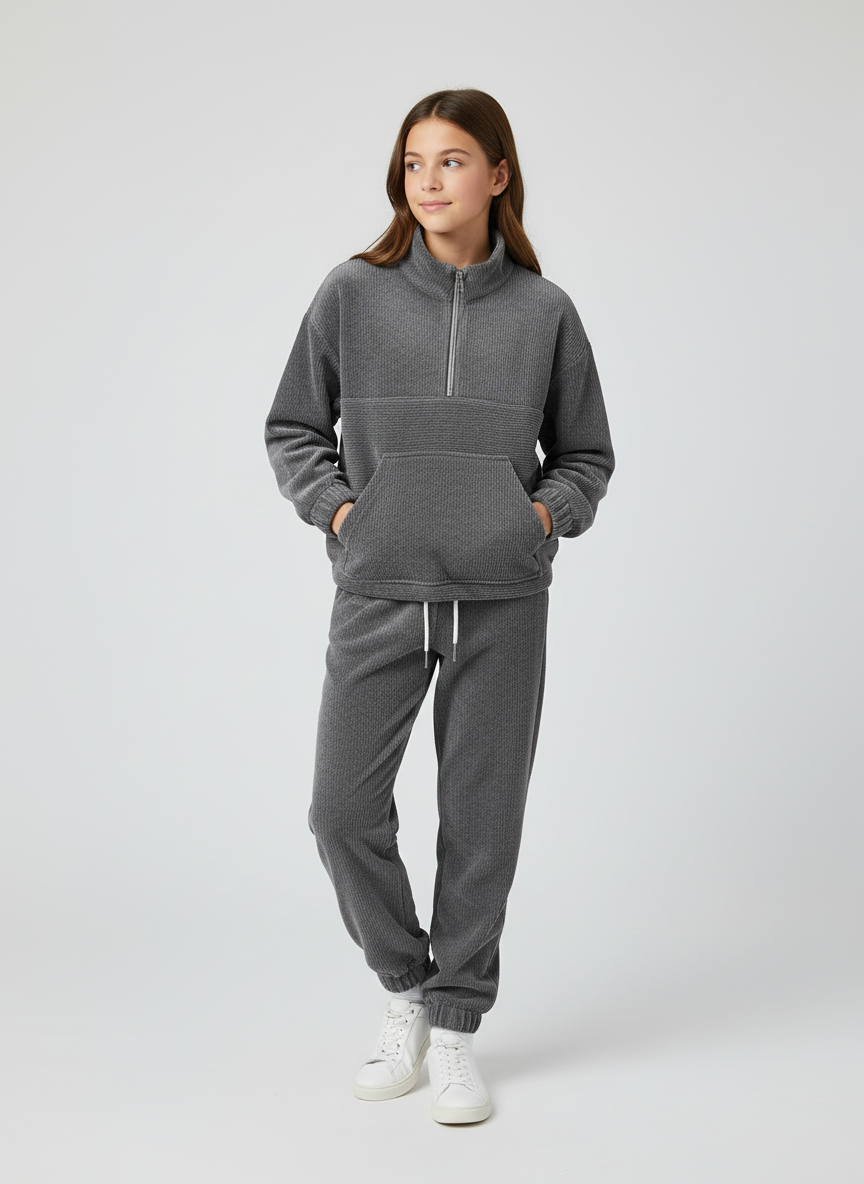 Zweiteiliger Trainingsanzug für Mädchen, bestehend aus Sweatshirt und Hose. Warmes, bequemes und weiches Rippstrickmaterial.