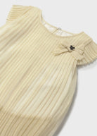 Vestito manica corta per neonata. Modello con scollo a barca. Chiusura con un unico bottone. Confezione in tulle leggero e vaporoso. Modello con fodera interna. Modello dal design plissettato. Elementi decorativi: glitter, fiocco. Questo esclusivo articolo appartiene alla collezione Cerimonia ed è stato pensato per ricorrenze, eventi e occasioni speciali.