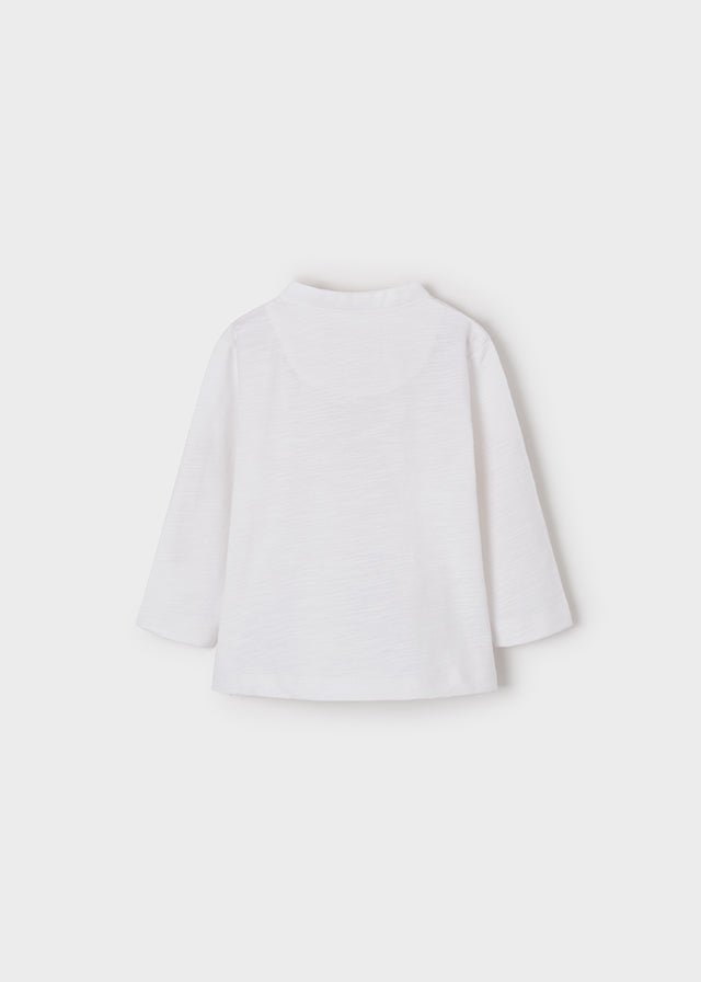 Long-sleeved T-shirt for newborns with buckle and side button to shorten the sleeves. Model with tone-on-tone mandarin collar. Button closure in the collar that makes the garment easy to wear.