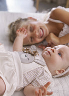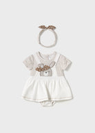 Pagliaccetto manica corta per neonata. Modello con finta salopette sovrapposta. Chiusura con bottoni a pressione nella parte posteriore. Chiusura con bottoni a pressione nell'interno cosce per agevolare la vestibilità. Elementi decorativi: ricamo. Design stampato.