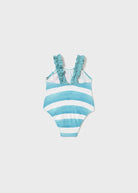 Maillot de bain une pièce imprimé « rayures et fleurs » bleu clair pour bébé fille, de la marque Mayoral.