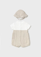 Barboteuse en fausse salopette beige rayée Mayoral pour nouveau-né avec chapeau
