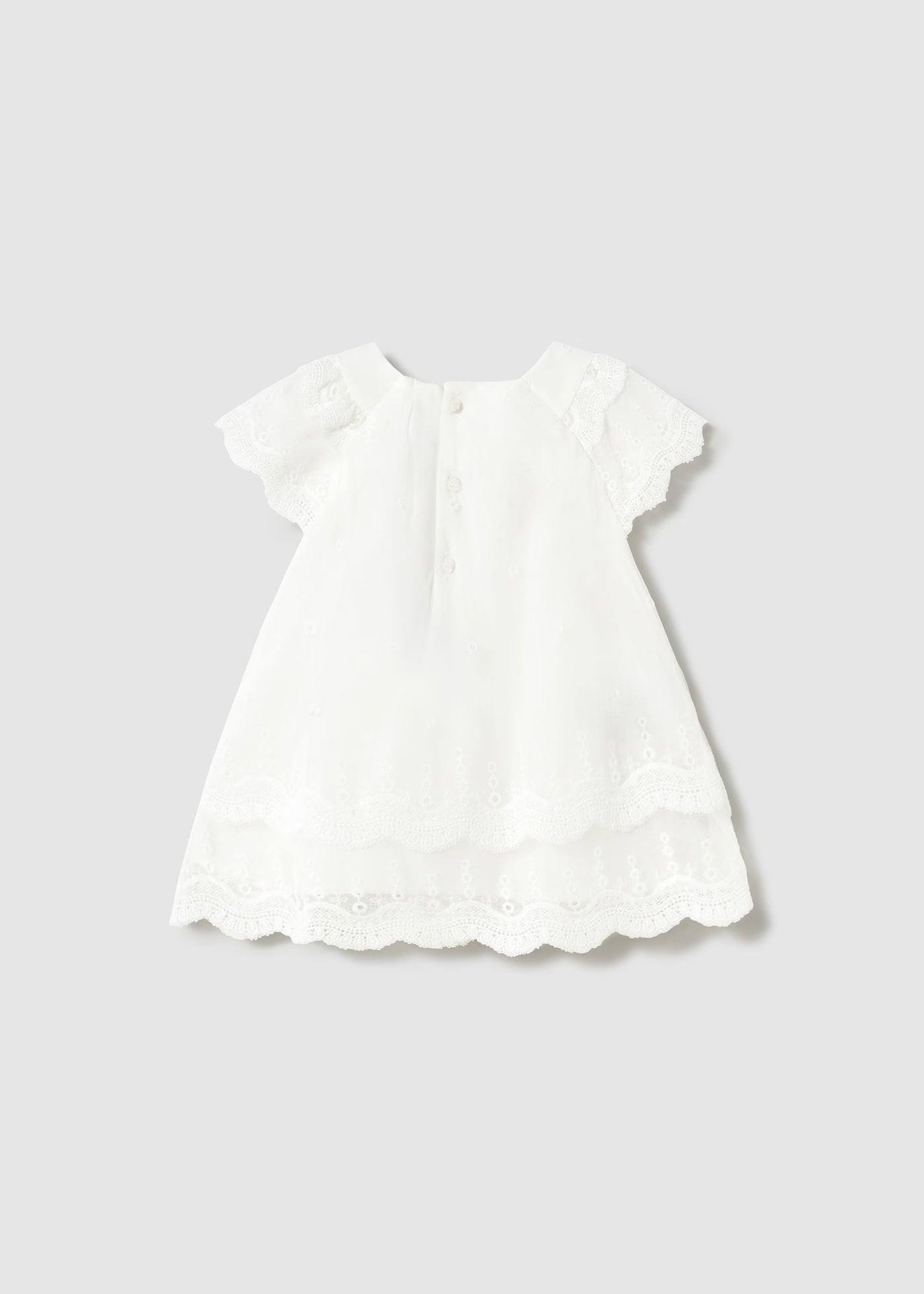 Robe à manches courtes et volants pour bébé fille. Encolure bateau. Fermeture boutonnée au dos pour un habillage facile. Confectionnée en tulle léger et aérien. Doublée. Ourlet à volants. Cette pièce exclusive fait partie de la collection Cérémonie et est idéale pour les anniversaires, les événements et les occasions spéciales.