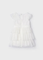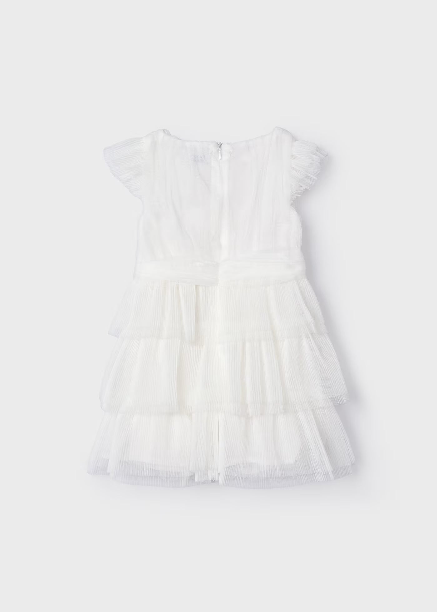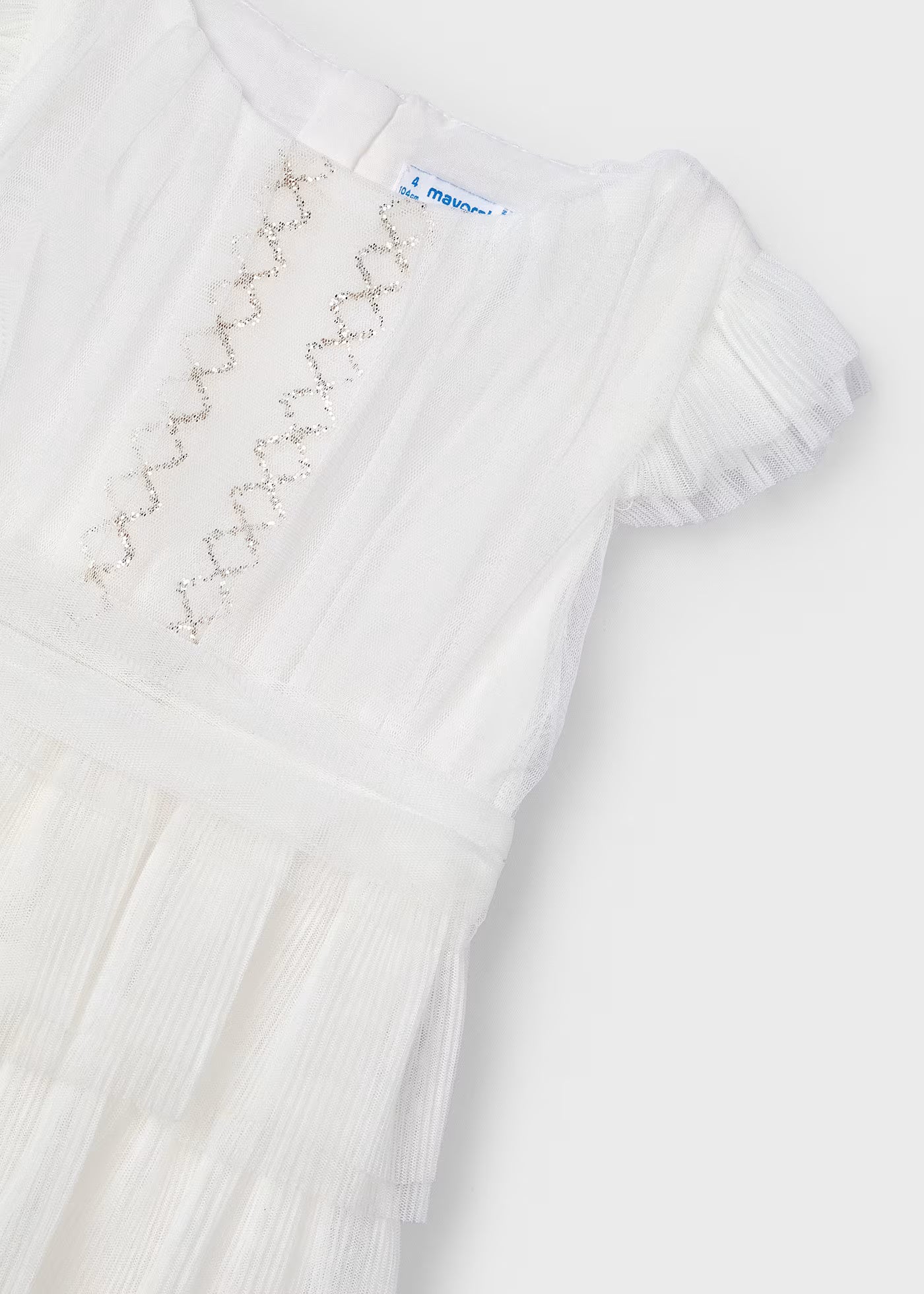 Vestito manica corta con volant per bambina. Apertura posteriore con cerniera invisibile. Confezione in tulle leggero e vaporoso. Modello dal design plissettato. Elementi decorativi: glitter, volant decorativi. Per motivi di sicurezza, le taglie piccole (2-3 anni) possono subire alcune variazione negli elementi decorativi utilizzati.