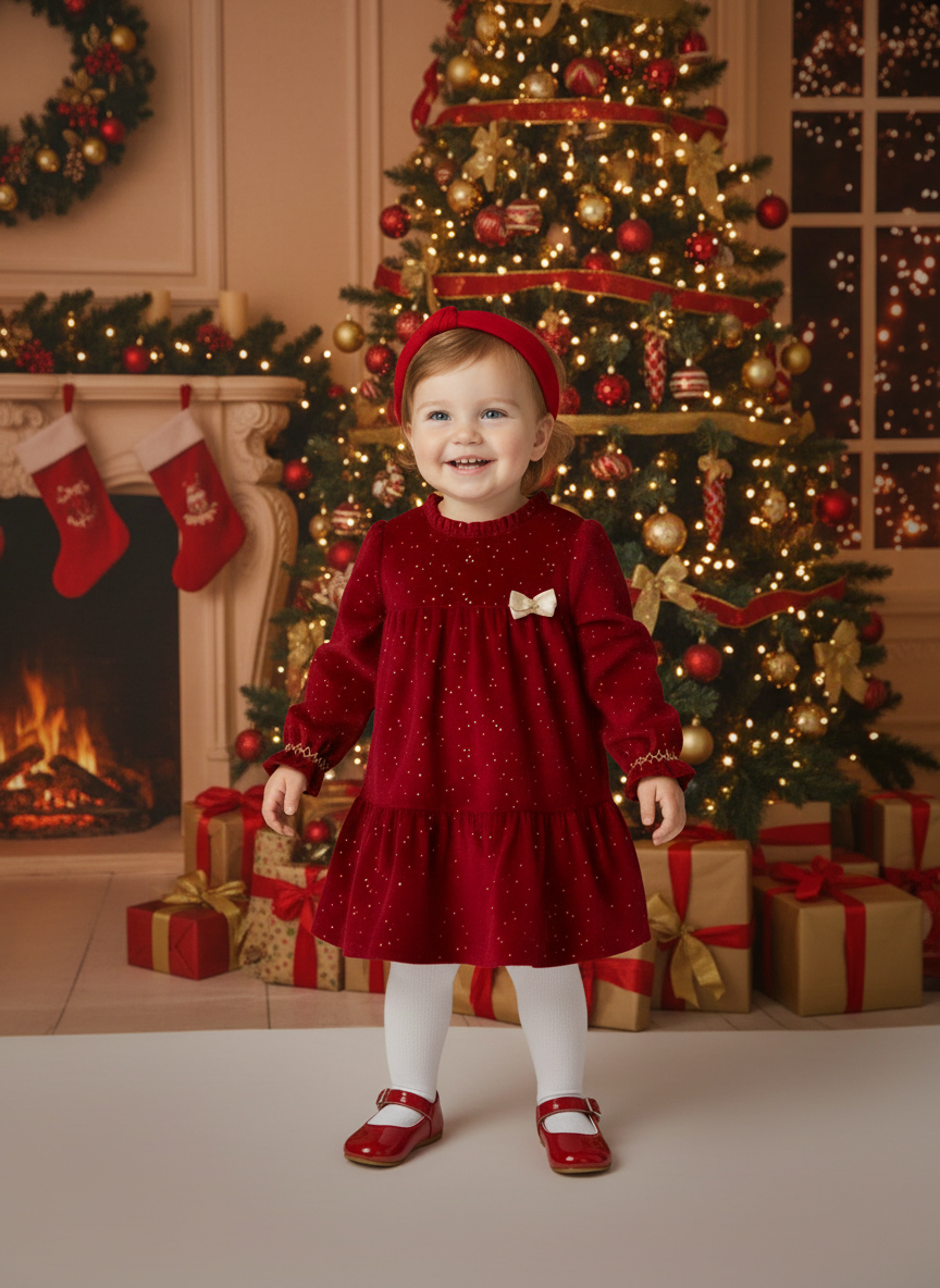 Vestito manica lunga per neonata con polsini elasticizzati. Apertura posteriore con cerniera invisibile. Confezione in velluto elegante e classico. Questo modello presenta dettagli nido d'ape. Elementi decorativi: glitter, fiocco. Modello della nostra linea più elegante ed esclusivamente pensata per vestire i più piccoli durate le occasioni speciali.
