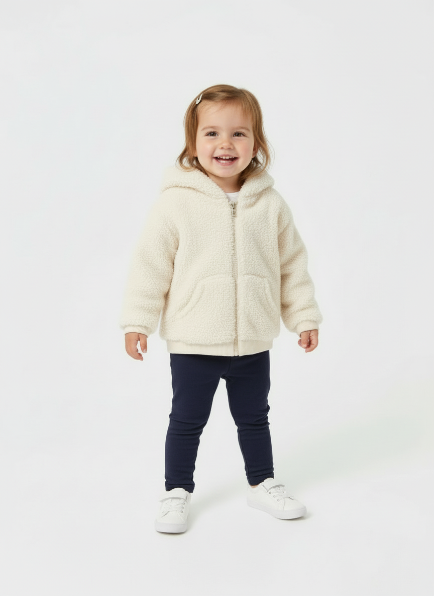 Felpa con cerniera manica lunga per neonata. Modello con cappuccio. Chiusura centrale con cerniera. Parte esterna in pellicciotto ideale per un look caldo.