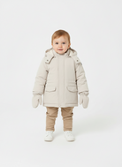 Giaccone manica lunga per neonato con polsini elasticizzati. Colletto avvolgente. Colletto con cappuccio rimovibile. Chiusura con bottoni nella parte anteriore. Chiusura centrale con cerniera. Cintura con cordoncino interno regolabile. Design con manopole rimovibili. Tasche funzionali nella parte anteriore.