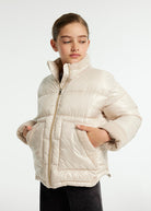 Giaccone manica lunga per ragazza. Colletto avvolgente. Chiusura centrale con cerniera. Tasche funzionali nella parte anteriore.