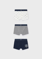 Set di tre boxer in cotone per bambino della nuova collezione Mayoral. Questa biancheria intima ha un elastico in vita e è stampata.