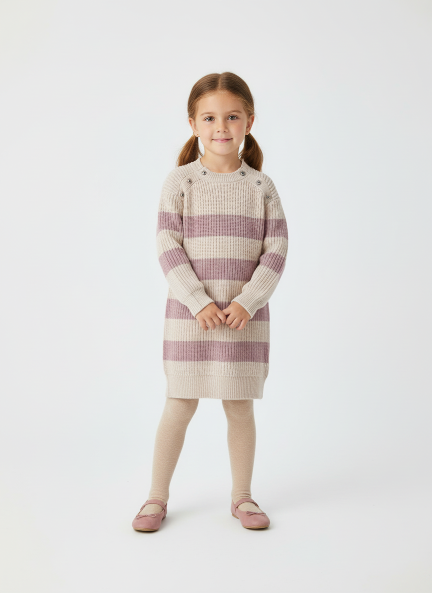 Vestito manica lunga per bambina con polsini elasticizzati. Tessuto in tricot morbido al tatto. Elementi decorativi: bottoni decorativi. Trama a righe.