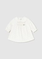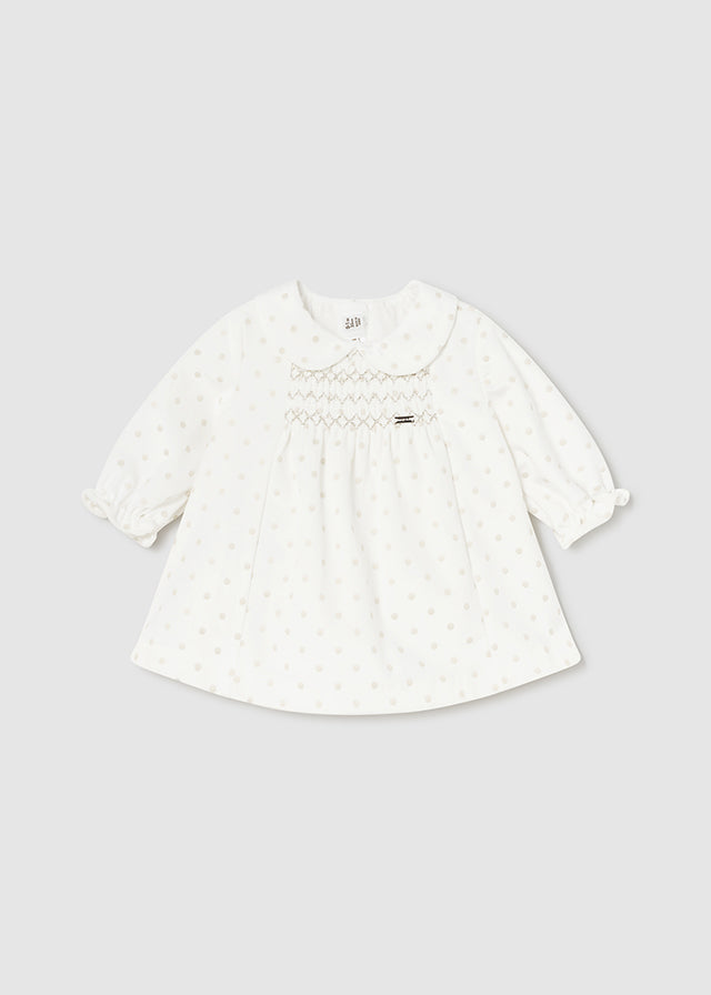 Vestito manica lunga per neonata con volant sul bordo della manica. Apertura posteriore con cerniera invisibile. Confezione in velluto elegante e classico. Questo modello presenta dettagli nido d'ape. Stampa a pois.
